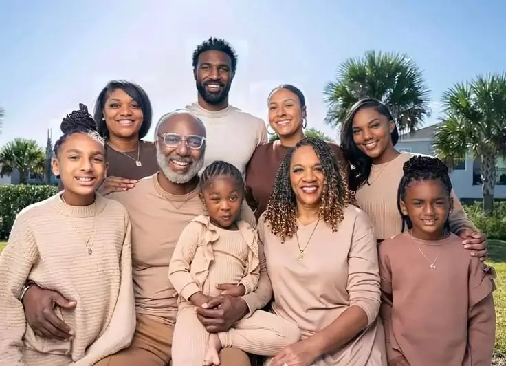 This extended family radiates warmth and unity in coordinated outfits of soft beige, taupe, and sand tones. Their minimal, neutral palette blends seamlessly for a polished yet approachable aesthetic.